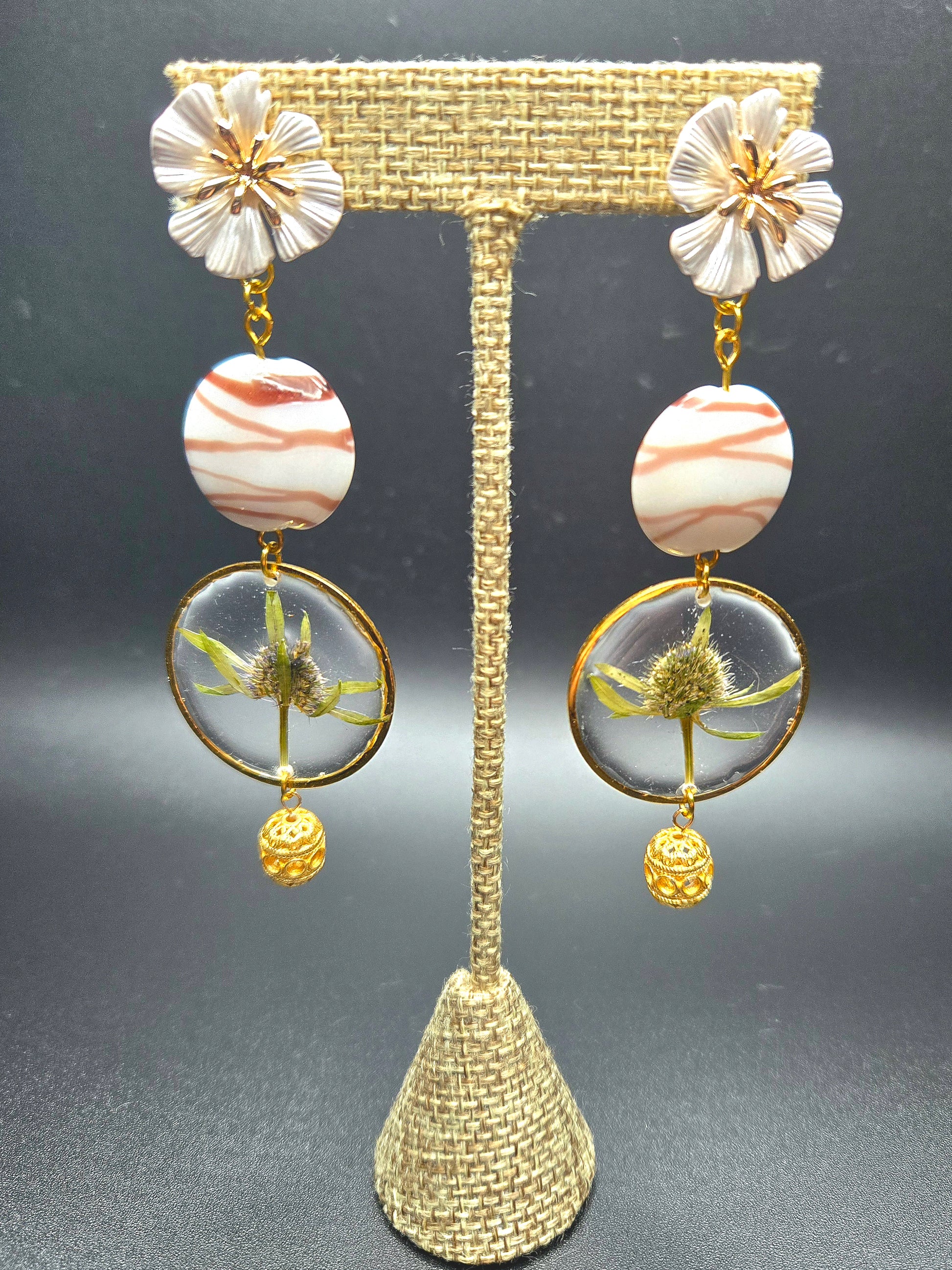 Gold colored dangle earrings with gold and glass beads. Beautiful white floral stud. 3.5 in long.